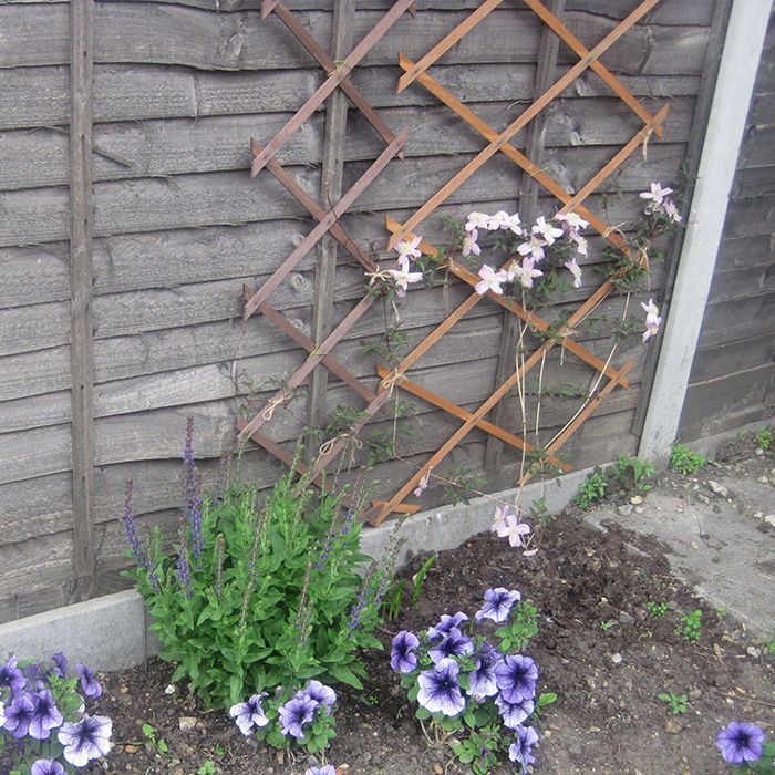 さてこちら、2015年の春に撮った植えたばかりのクレマチス(英国でよく見かけるモンタナ系)です。