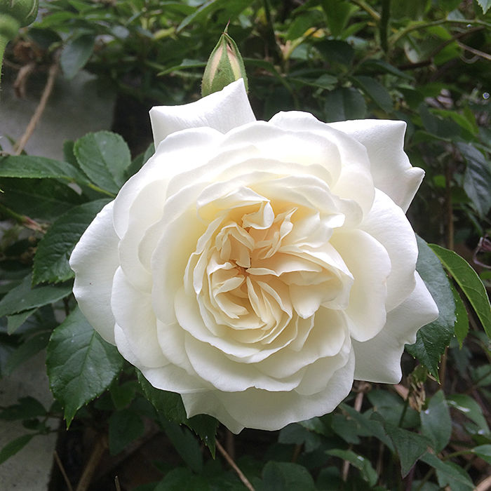 その横に植えあるのが、つるアイスバーグ。一番花は花びら多めのロゼッタ風!?イアンのお気に入りの純白の薔薇。