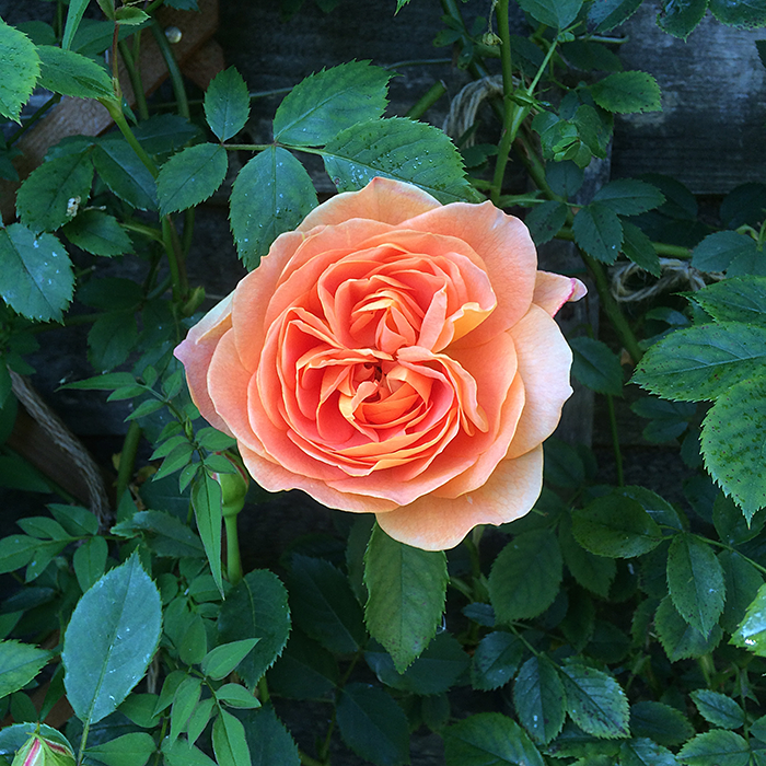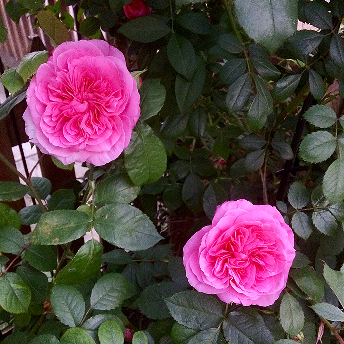 毎年最初に咲くのはいつもイングリッシュローズのレディオブシャーロット。イアンと出会った年に発表された品種ということで植えました。