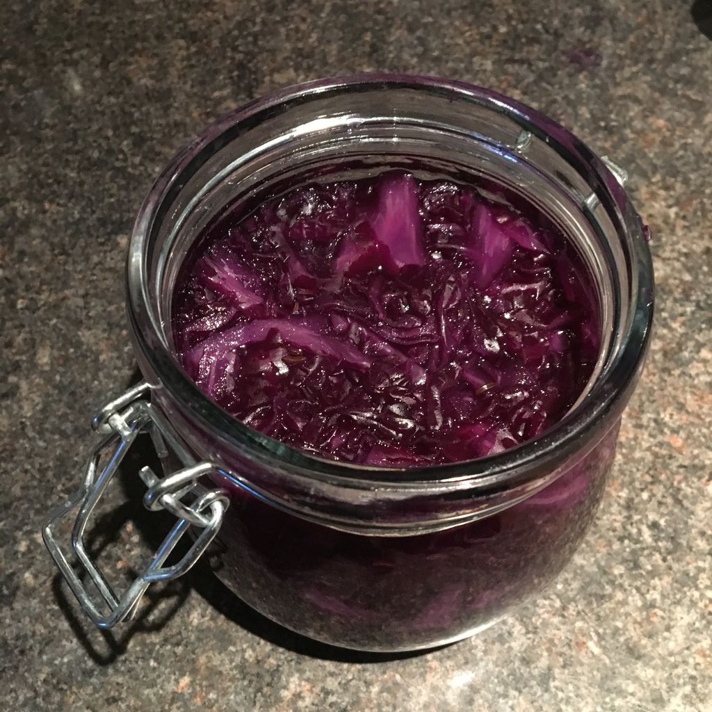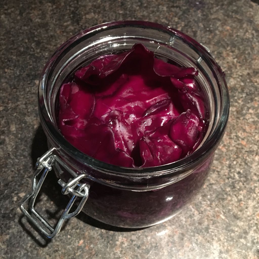 赤キャベツは固いので、芯を取り塩を振って麺棒を押し付けるように転がすか手で叩いてしんなりさせてから落としぶたのようにしっかりと入れ、私は更にその上にサランラップをピッタリ貼付け、空気に触れないということだけは死守。