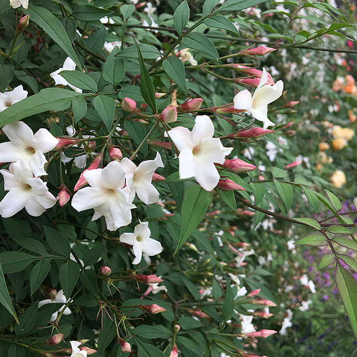 そしてこちら我が家の庭。今ちょうどコモン・ジャスミン(Jasminum officinale)がとても良い香りを放っています。数年前にスーパーで買った2ポンドもしなかった苗ですが、虫つかず病気にもならず、すっかり大きくなりました。