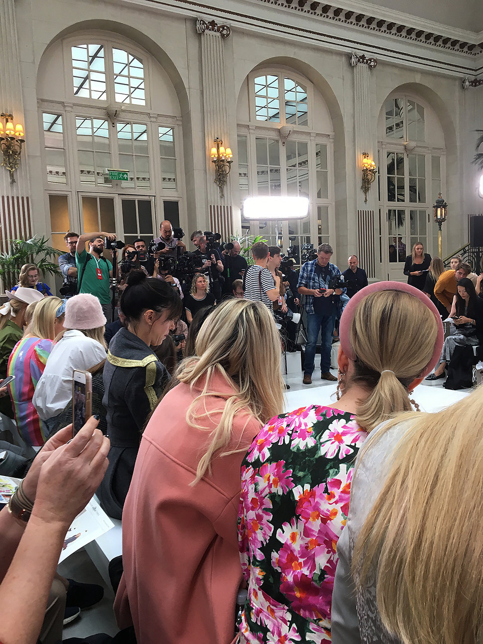 キャットウォークの突き当たりにはカメラの群、案内されたのが前から二番目の席でドキドキ。