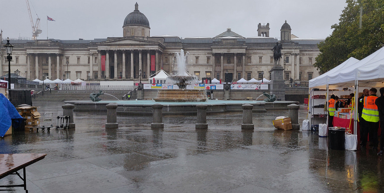 雨の中、トラファルガー広場での準備中の風景。向こうに見えるのはナショナル・ギャラリー。