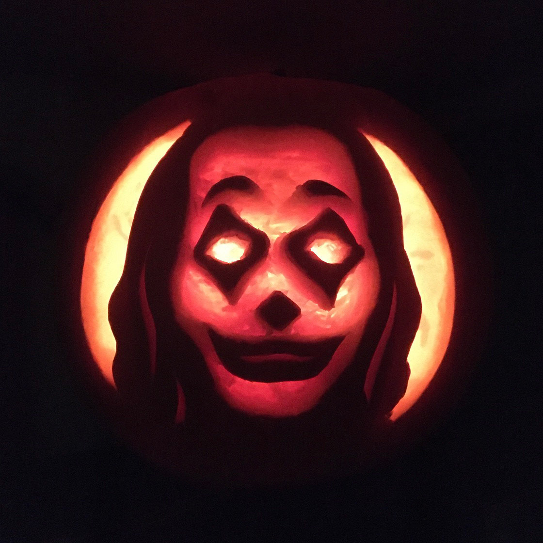 今年の我が家のジャックオランタンは話題のジョーカー。子供達怖がるかなと思ってちょっと悩んだけど、見向きもしなかったワ!興味持って話しかけてくれる大人はちらほらいて、そういうのも嬉しいんだけどね。