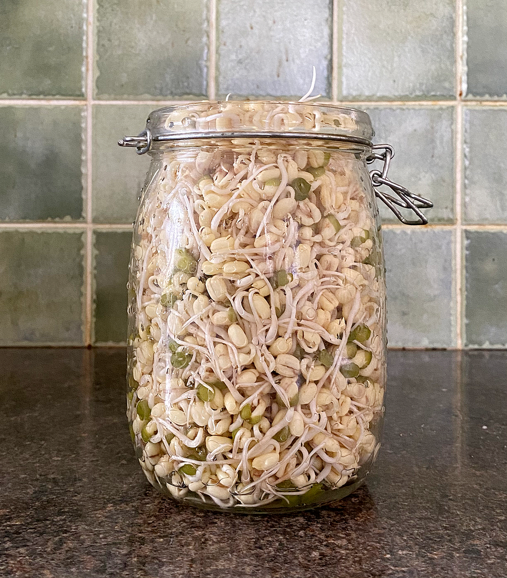 ふと思い立ってもやしを育ててみたら、6日目で1リットルの容器から溢れてきてしまいました。半分湯がいて食べてみたら、もやしというより豆の味がしっかりしていて美味しかった!