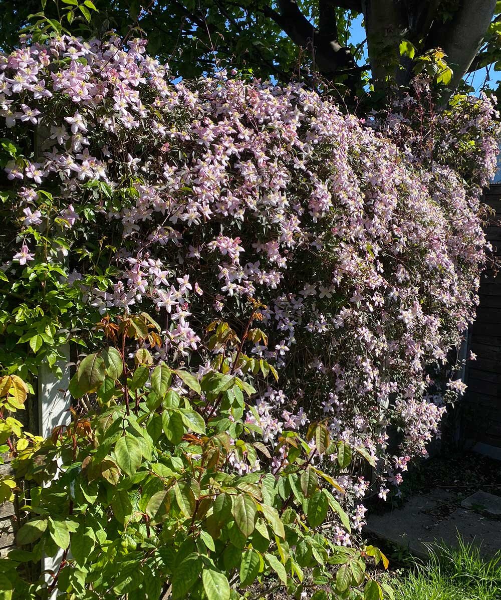 去年は板塀が壊れたりお隣の工事で刈り込んだりで枯れた枝もだいぶあったしダメージを与えてしまっていたのも原因の一つだと思うけど。ツルをどう整理したらいいのかわからないくらい絡まりあっていたので良い機会かもしれません。(2020年の写真↓)