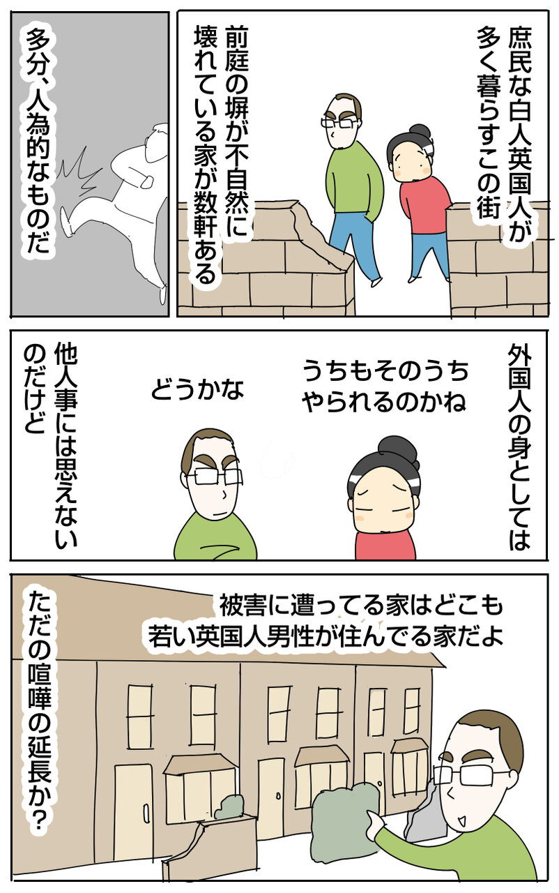 2023年09月21日 庶民なイギリス人の街で見た嫌がらせ パブで喧嘩でもしてその仕返しでやられたのかな、みたいな。近所で暮らす外国人の家はうちも含めて無傷です。イギリスは街によって雰囲気が全く違って、ロンドン市内でもヤバイ雰囲気の街もあればキラキラしてるエリアもあります。どんな街で暮らすかはだいたい経済事情に左右されるのですが(家の値段が全く違う)、庶民な私達は庶民な街で暮らしているのでこういうこともあったりします。今日も遊びにきていただいてありがとうございます。 「ご近所関係」カテゴリの最新記事 タグ :#イギリス生活 < 前の記事次の記事 >