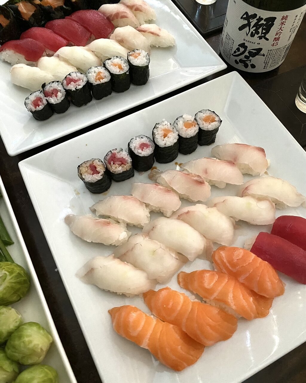 自分で握るのは面倒だけどレストランで注文するには躊躇する高いお酒も飲めちゃうしヒラメだって食べ放題♪ 軍艦に入っているのはサーモンの切れ端だけどね。
