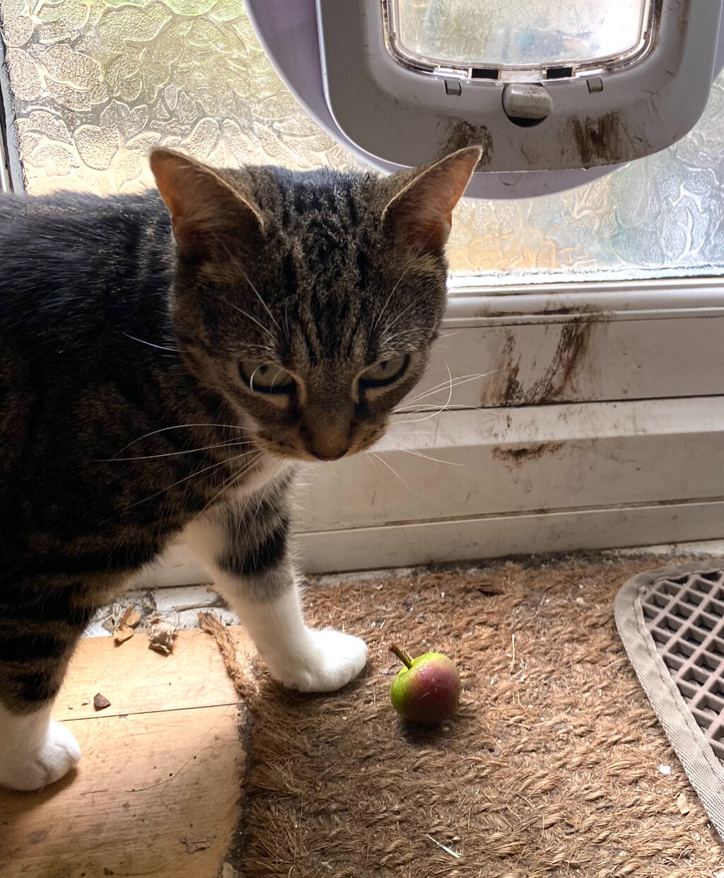 うちにりんごは植えてないので他所の庭から拾ってきてるはずなのですが、猫が庭を出入りすることにご近所さんは寛容でいてくれてるし、りんごで遊ぶタビサは可愛いし、キツネはあちこち掘ったり臭い糞はしていくけどエキノコックスや狂犬病の心配はなくて、うちの中に落ちてるりんごから今のところまだ虫湧いてないしっていうかG居ないし。イギリスのこういうところ気に入ってます。