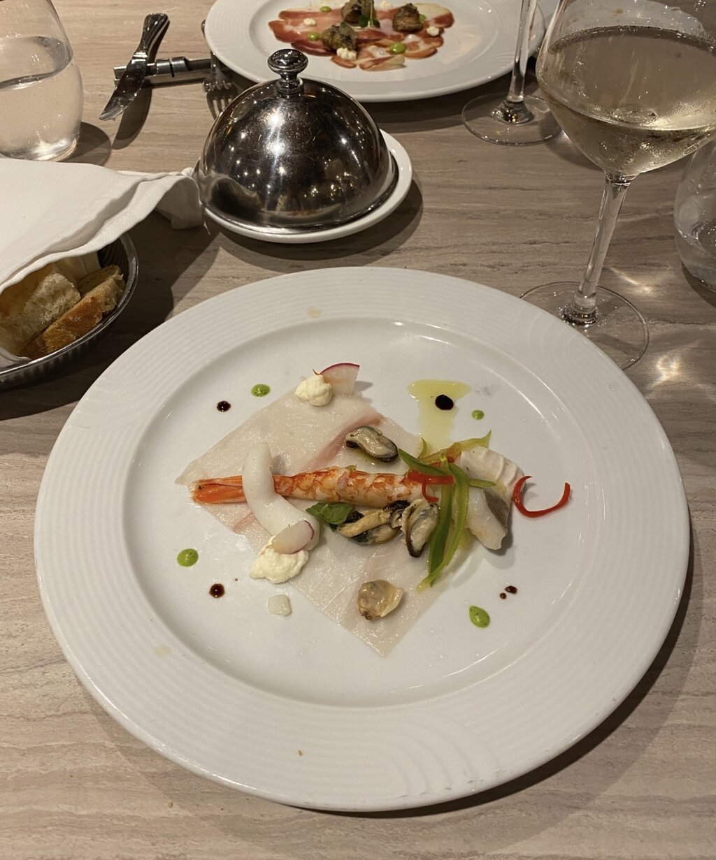 こちらはレストランのテーブル、前菜のカルパッチョだったかな。タタキが出た時はバッフェでばくついてました。