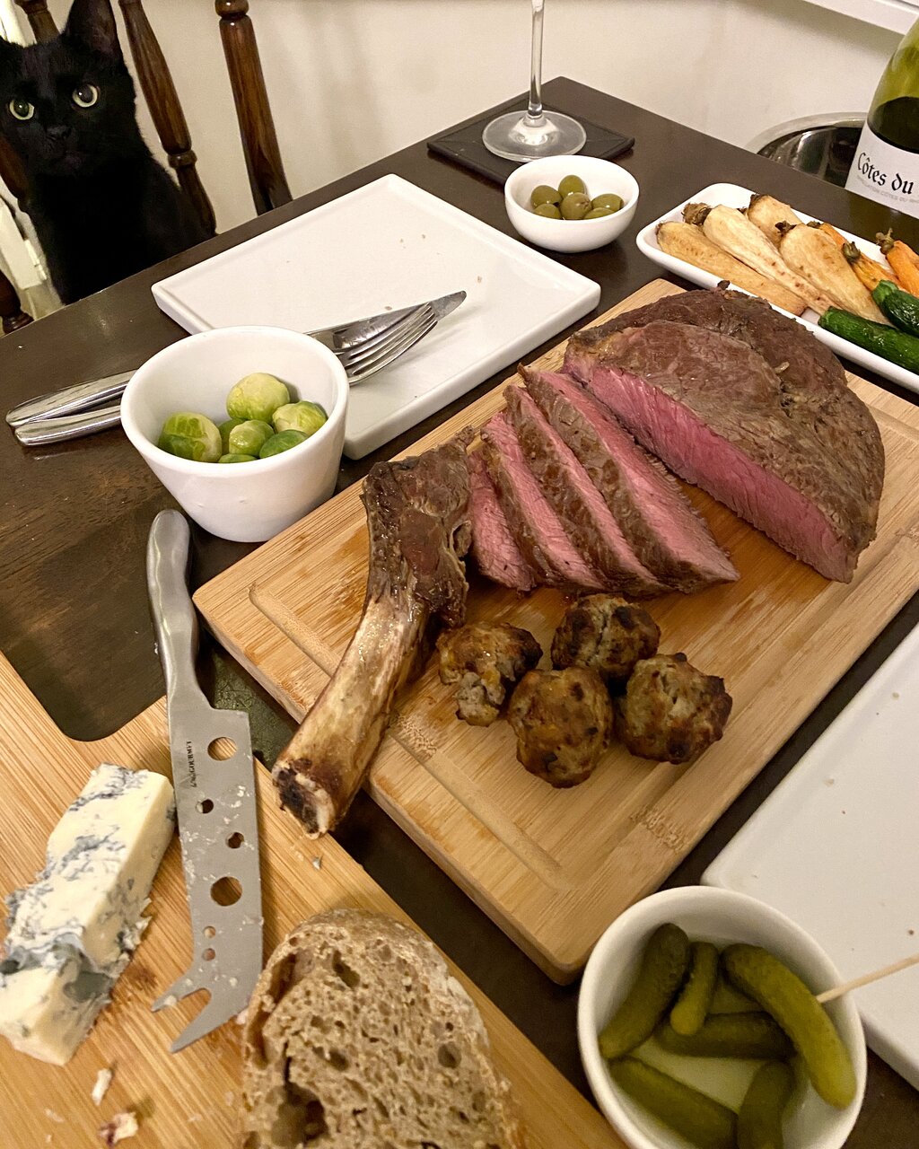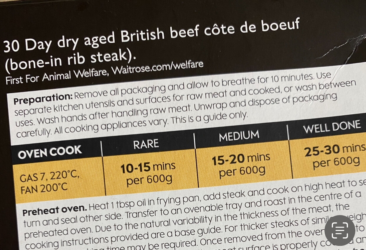 今年の我が家のクリスマスのメインディッシュはCote de boeufいわゆる骨付きリブロースだったのですが、こういう焼き加減が気になる良い牛肉は滅多に料理しないし失敗したら勿体無いしで慎重になりました。調理する数時間前には冷蔵庫から出して室温に戻したお肉をフライパンで焼いてからオーブンへ、いわゆるローストビーフなのですが、オーブン220度(ファン付き200度)とパッケージには書いてあったのを見て「こんな高温で焼いちゃうの!?」。ググってみると同様に書かれてたサイトが出てきたり、低温で長時間焼くケースなんてのもあったり結構まちまちだったので、とりあえず私は無難にフライパンで焼いた後ホイル被せて180度で15分焼いてから10分ほど休ませました(お肉は780g)。